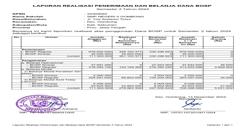 Penggunaan dana BOS SMPN 4 Gombong Semester II Tahun Anggaraa 2024 dapat kami laporkan sebagai berikut:
